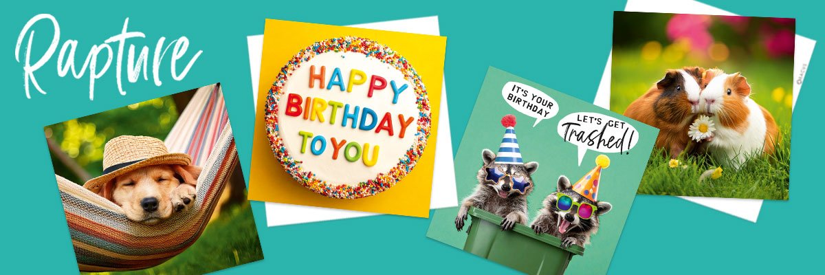 Rapture offers an excellent choice of fun, brightly coloured easy to send images that are appropriate for a wide range of recipients. This well-regarded range continues to expand with a delightful parade of funny and adorable animals, colourful birthday cakes and balloons.